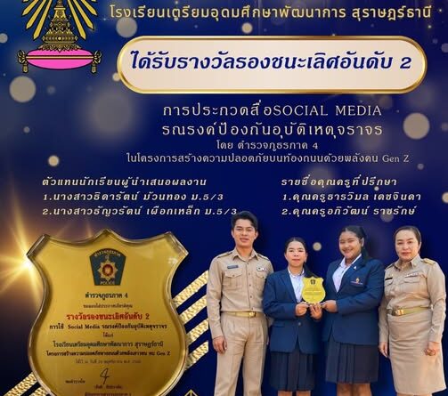 โรงเรียนเตรียมอุดมศึกษาพัฒนาการ สุราษฎร์ธานี ขอแสดงความยินดีและชื่นชมคณะครูผู้ฝึกซ้อมและนักเรียนผู้เข้าร่วมการแข่งขันการประกวดสื่อ Social Media รณรงค์ป้องกันอุบัติเหตุจราจร ได้รับรางวัลรองชนะเลิศลำดับที่ ๒